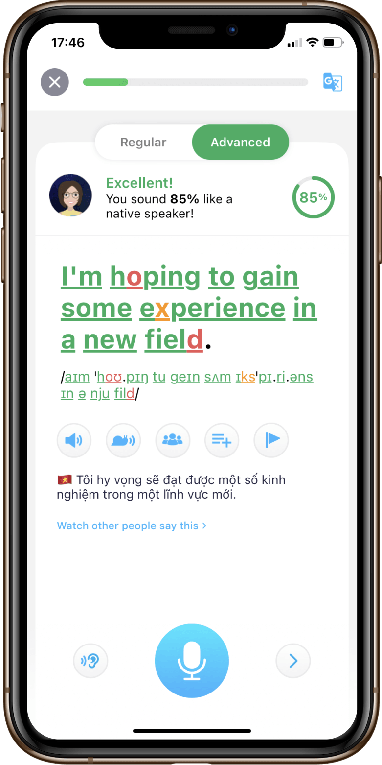 Công nghệ của ELSA có khả năng chỉ ra lỗi sai trong từng âm tiết, đưa ra nhận xét & hướng dẫn sửa tức thì. Cung cấp các đoạn hội thoại thực tế của người bản xứ, các đoạn video hướng dẫn cách đặt môi, lưỡi, giúp người học tiến bộ mỗi ngày.