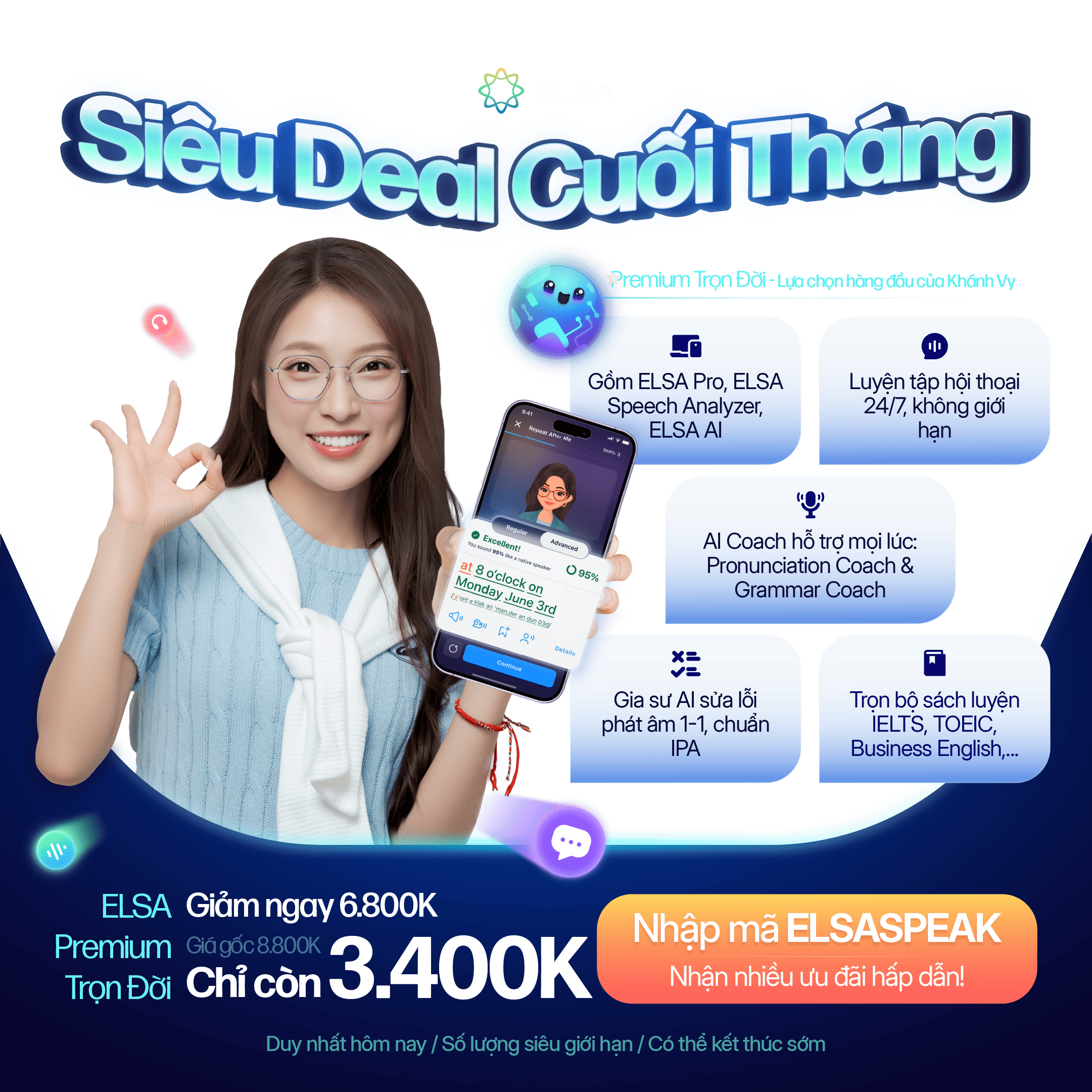 - Học thử miễn phí 7 ngày, được trải nghiệm toàn bộ tính năng và bài học của ELSA Speak.