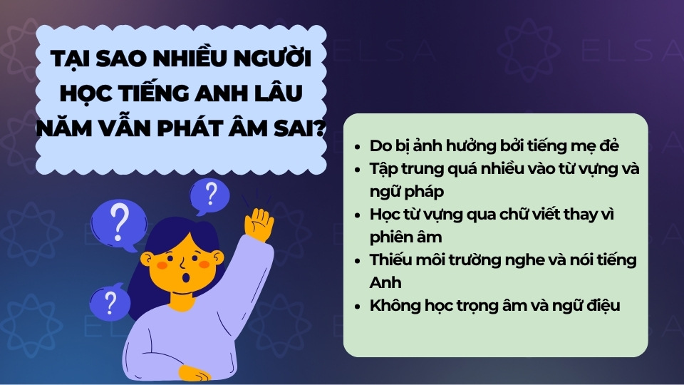 - Do bị ảnh hưởng bởi tiếng mẹ đẻ: Người học thường áp dụng hệ thống âm thanh tiếng Việt vào tiếng Anh, gây nên tình trạng phát âm sai những âm không hề tồn tại trong tiếng Anh như: /θ/, /ð/, /ʃ/.