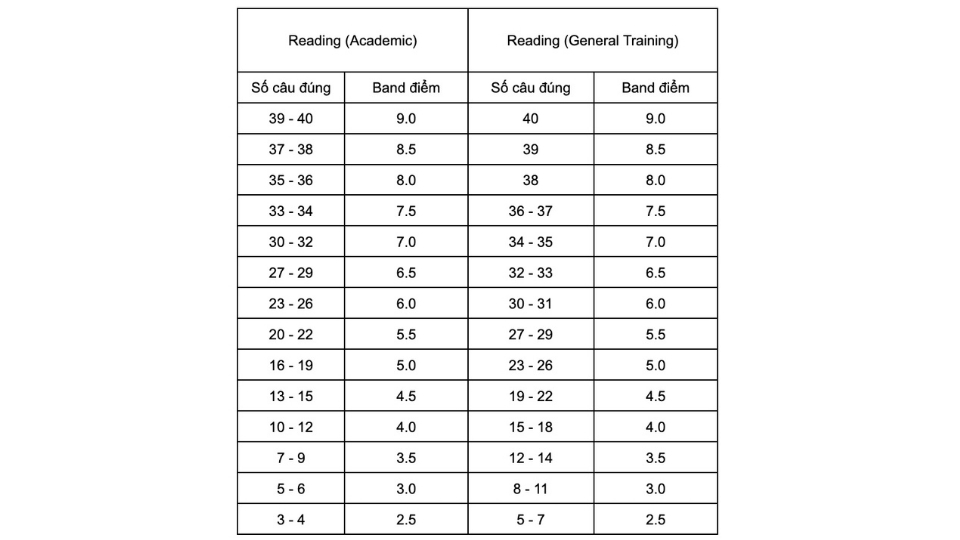 Dưới đây là bảng điểm quy đổi IELTS Reading với 2 dạng bài thi là Academic và General Training: