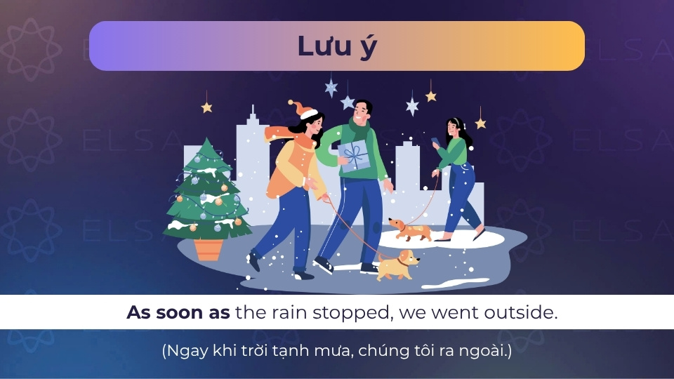 As soon as, nghĩa là “ngay khi”, là một cụm liên từ chỉ thời gian để diễn tả sự diễn ra nhanh chóng và liên tục giữa hai hành động, nhấn mạnh việc một hành động xảy ra lập tức sau khi hành động khác vừa kết thúc. Cấu trúc ngữ pháp này thường xuất hiện trong các câu mô tả sự nối tiếp liên tục về mặt thời gian.