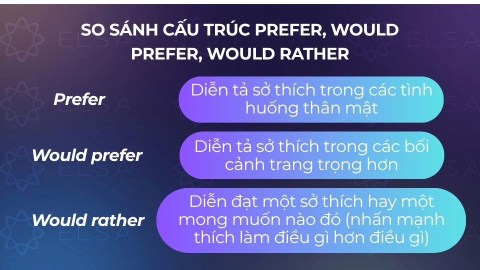 | Would prefer | Diễn tả sở thích trong các bối cảnh trang trọng hơn. | Would prefer + N/ to V Would prefer + S + to V Would prefer + to V rather than V |