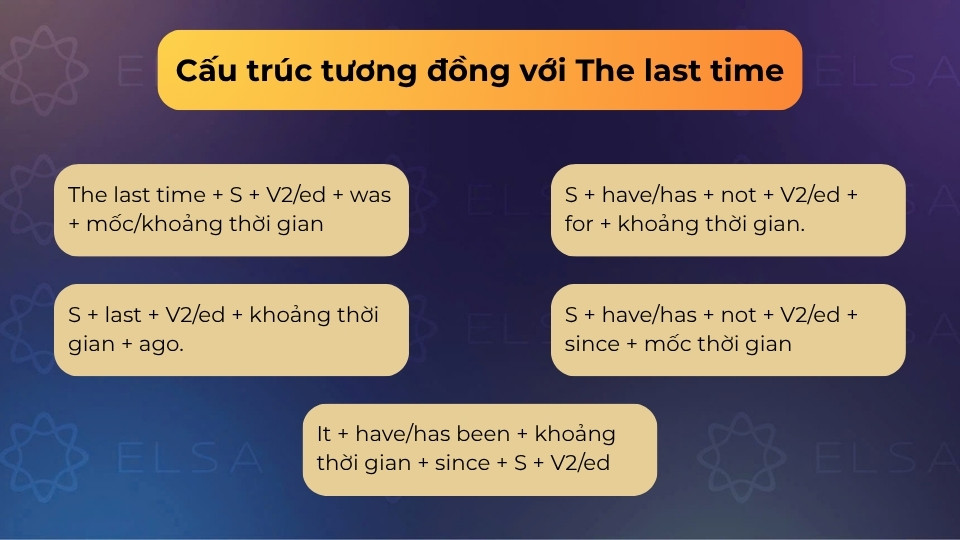 The last time + S + V2/ed + was + mốc/khoảng thời gian. | The last time I played the piano was 3 months ago. | Lần cuối cùng tôi chơi piano là 3 tháng trước. |