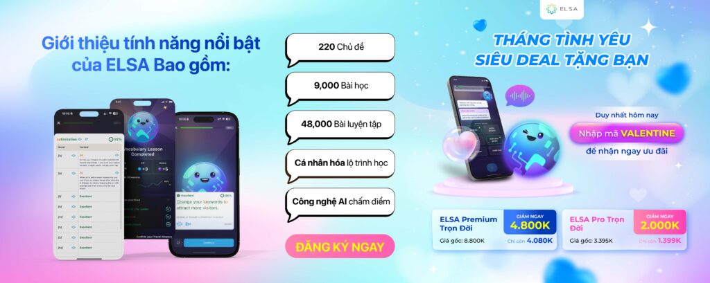 - Học tiếng Anh giao tiếp tại ELSA Speak: Nếu bạn đang tìm cách nâng cao khả năng giao tiếp tiếng Anh, đặc biệt là khi ăn uống cùng bạn bè hoặc đối tác quốc tế, ứng dụng ELSA Speak chính là lựa chọn tuyệt vời. ELSA Speak giúp bạn cải thiện phát âm từ vựng tiếng Anh thông qua các bài học tương tác và các tình huống thực tế.