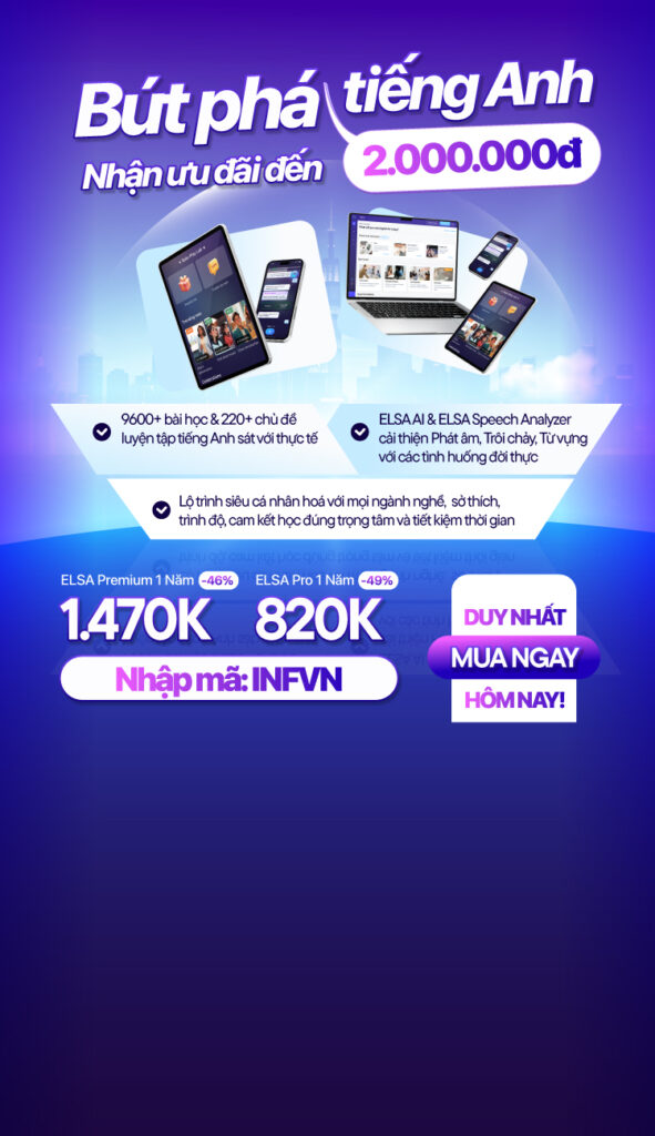 Nếu bạn muốn hệ thống lại toàn bộ kiến thức ngữ pháp từ căn bản đến nâng cao, hãy xem ngay khóa luyện ngữ pháp cùng ELSA Speak để “đánh bay nỗi lo ngữ pháp” chỉ trong vài phút mỗi ngày! Xem ngay 👇