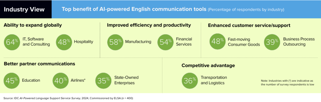 Across industries, the impact of language capability follows consistent patterns. Clearer communication supports productivity and operational efficiency in manufacturing and logistics. In customer service and sales, its impact is reflected in response times, customer satisfaction, and retention. Meanwhile, professional services and technology rely on strong communication to enable faster collaboration and effective cross-border operations.
