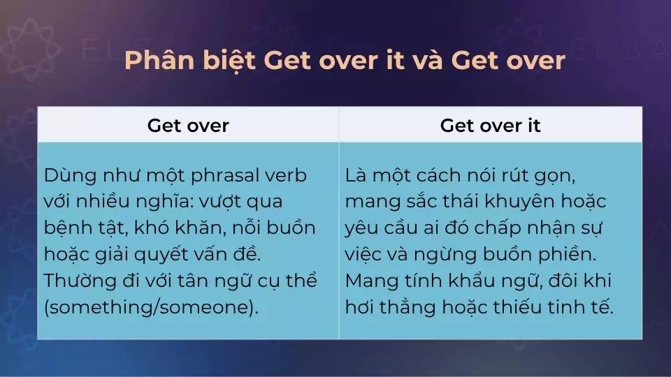 | Ví dụ | She finally got over her illness. (Cô ấy đã hồi phục sau bệnh). | She was upset, but she’ll get over it soon. (Cô ấy đang buồn nhưng rồi sẽ sớm vượt qua thôi.) |