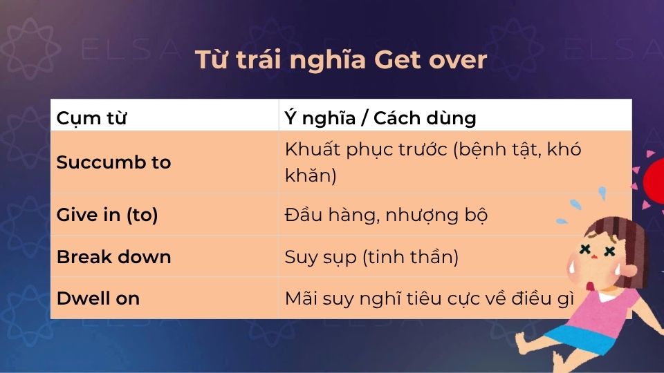 | Get over something | Vượt qua bệnh tật, nỗi buồn hoặc khó khăn | She is trying to get over the flu.(Cô ấy đang cố hồi phục sau cúm.) |