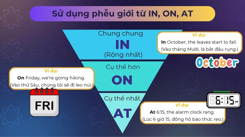 Cuối cùng, đáy phễu là vị trí của giới từ at, dùng để chỉ thời điểm chính xác như giờ giấc hoặc thời gian quen thuộc trong ngày.