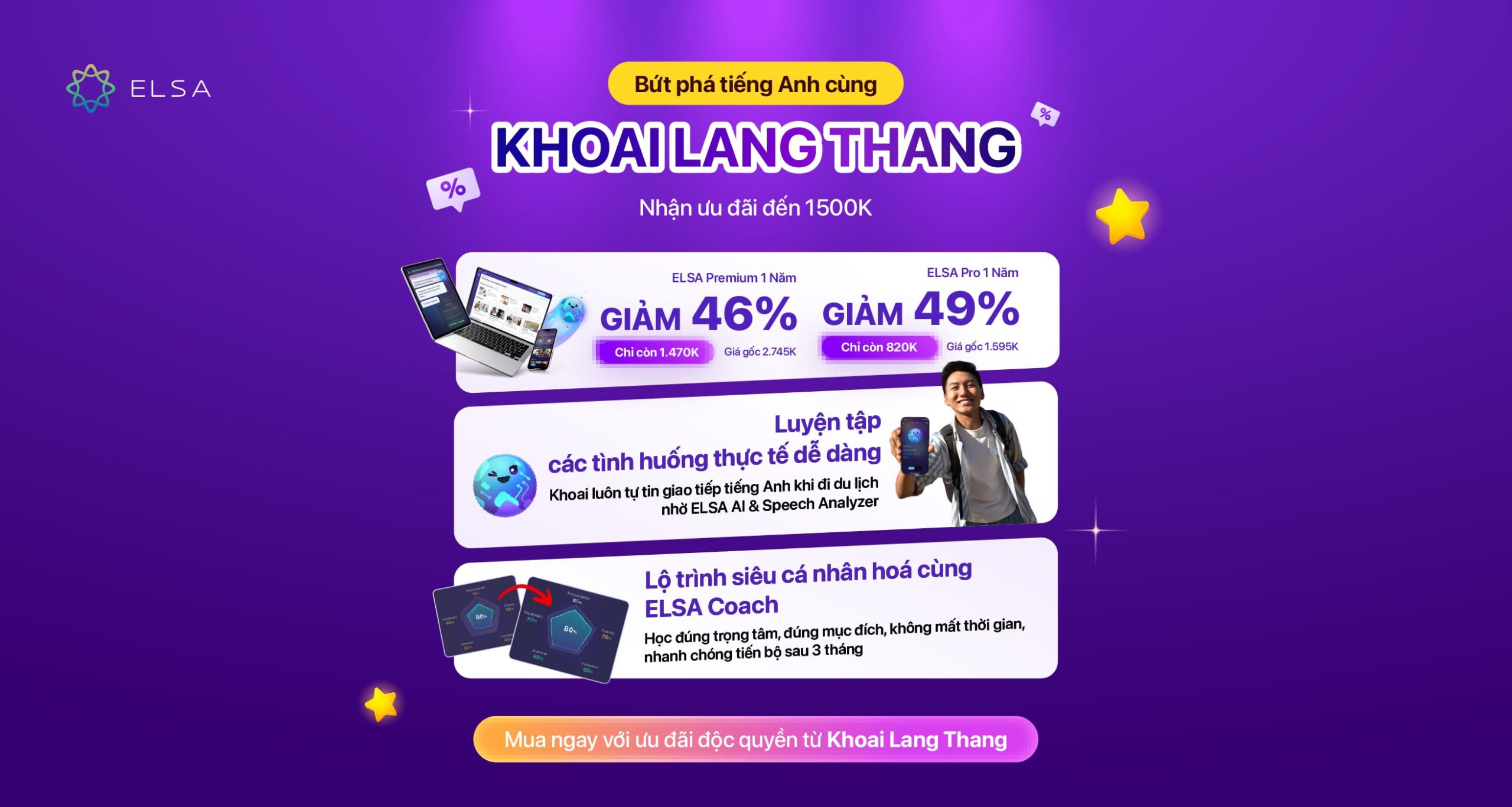 Đặc biệt với gói ELSA Premium mở khóa toàn bộ bài học và tính năng nâng cao, giúp người học có cơ hội luyện tập không giới hạn với lộ trình cá nhân hóa, từ điển phát âm chuyên sâu và các bài tập thực tế sát với bài thi trước khi đăng ký thi IELTS.