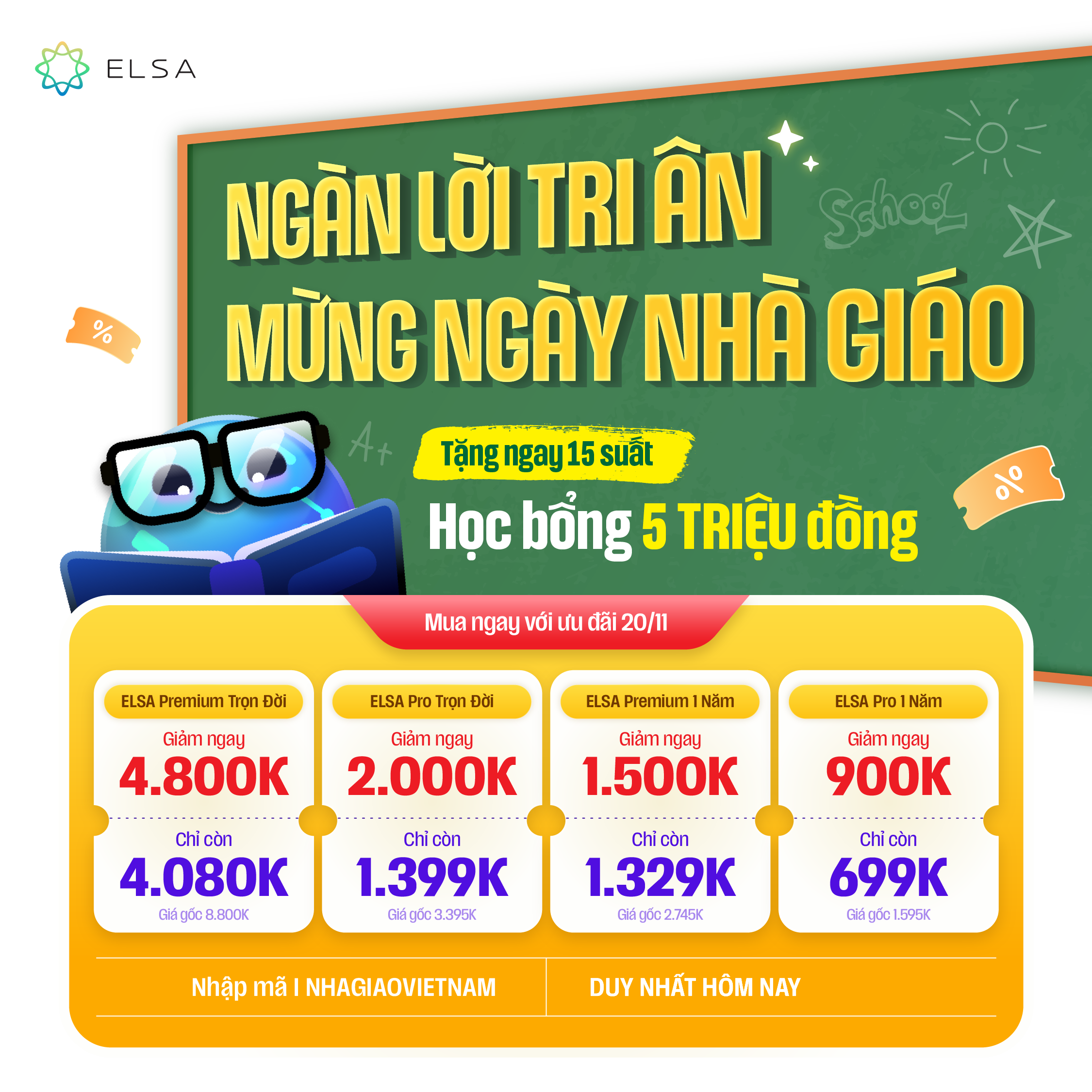 Hot: ELSA Speak vừa mở bán trở lại gói ELSA Pro, ELSA Premium với phiên bản 2025 cực xịn sò. Mừng quay trở lại với diện mạo mới – Elsa Premium, Elsa Pro giảm GIẢM GIÁ HẤP DẪN trong duy nhất hôm nay.