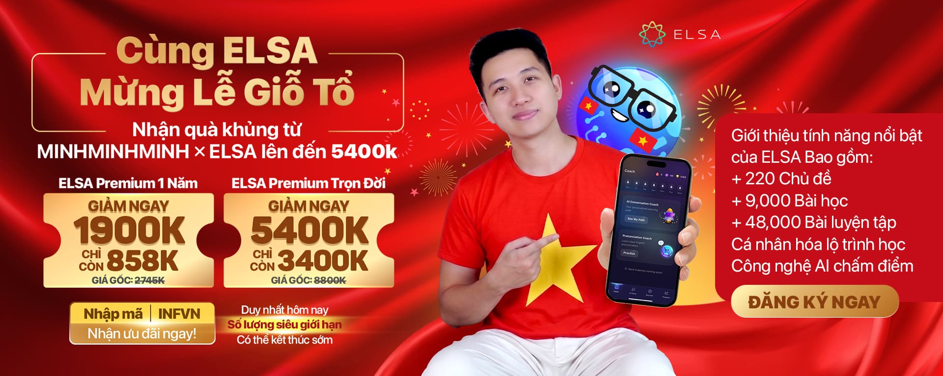 Đừng quên nâng cao khả năng tiếng Anh giao tiếp của bạn với ELSA Speak Premium. ELSA Premium giúp bạn nâng cao kỹ năng tiếng Anh nhờ vào hơn 8,000 bài học, lộ trình cá nhân hóa cùng các bài thực hành hội thoại tiếng Anh trong các tình huống thực tế,… Đặc biệt ELSA Premium đang có chương trình ưu đãi giảm giá cực sốc. Click để khám phá ngay!