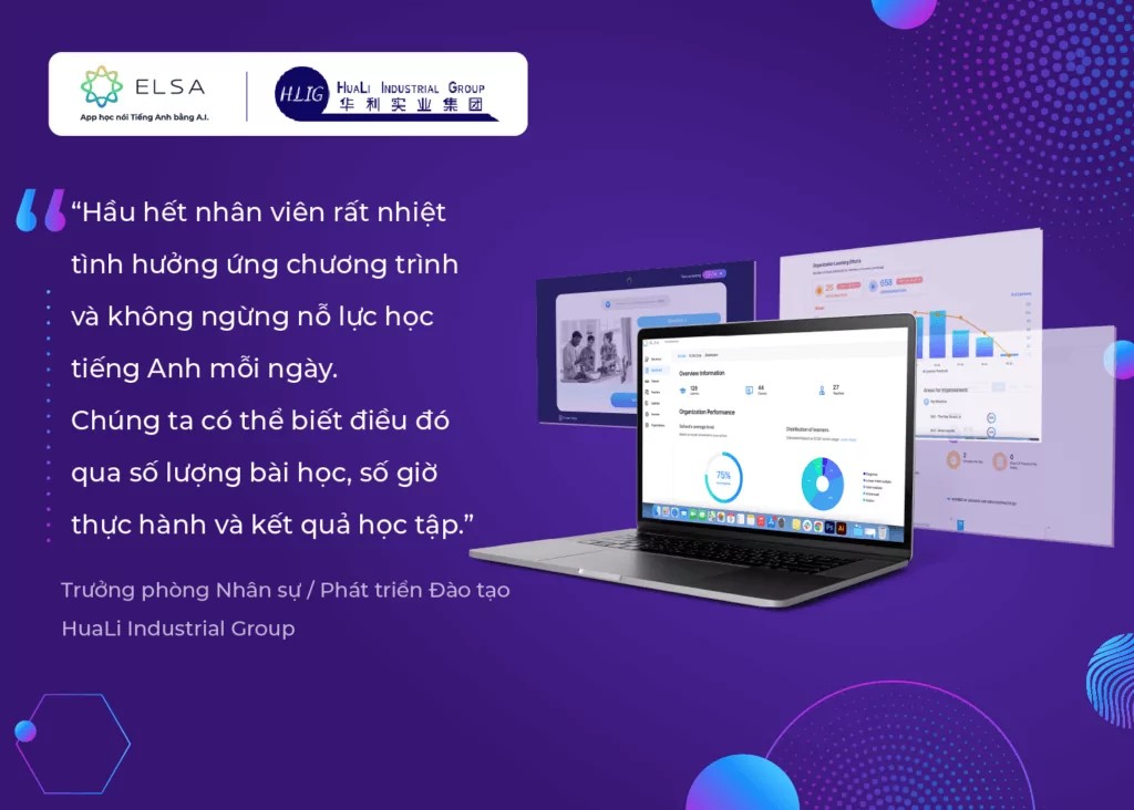 Nhân lực được cho là yếu tố quyết định trong thành công của HuaLi Industrial Group. Do đó, nhiệm vụ quan trọng nhất của HuaLi Industrial Group là tập trung những nguồn lực tập đoàn có vào việc bảo vệ lợi ích cho đội ngũ nhân viên. Hợp tác với ELSA Speak đã cung cấp cho HuaLi Industrial Group giải pháp đào tạo tiếng Anh chuẩn quốc tế mà tập đoàn đang tìm kiếm.