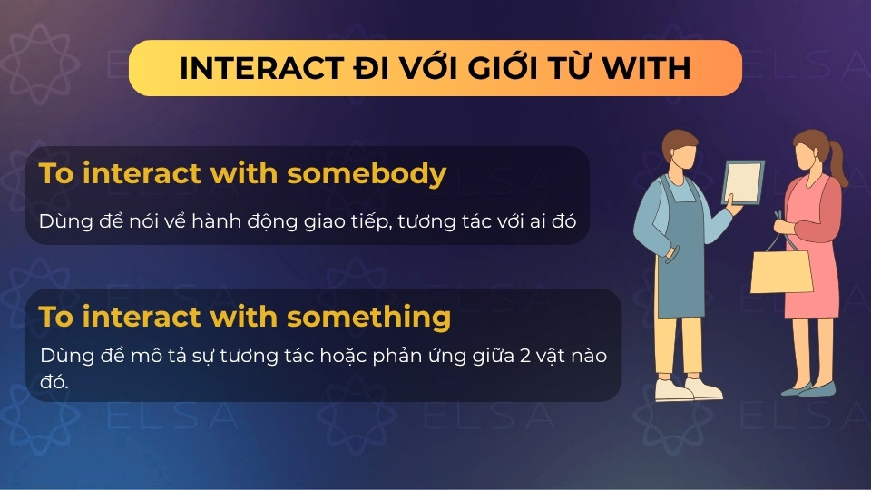 Giới từ thường đi sau từ “interact” là giới từ “with”. Khi sử dụng giới từ này, sẽ có 2 cấu trúc như sau: