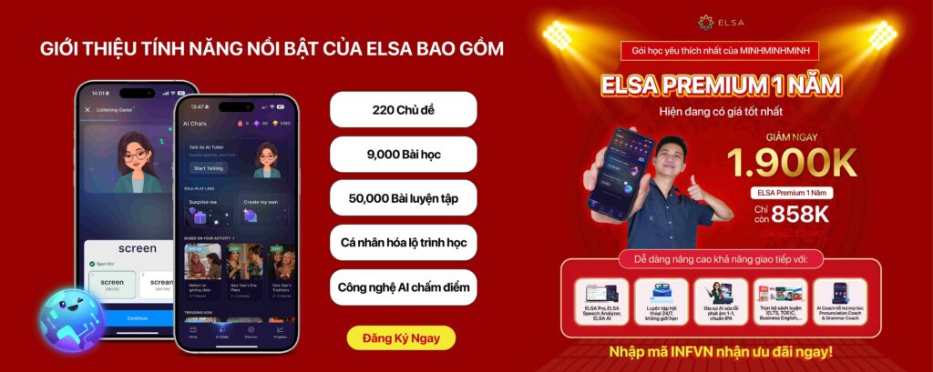 >>> Tìm hiểu thêm: Học giao tiếp tiếng Anh dễ dàng cùng ELSA Speak! Với gia sư AI thông minh cùng lộ trình học cá nhân hóa, ELSA Speak giúp bạn cải thiện phát âm, ngữ điệu và phản xạ tiếng Anh chỉ sau vài tuần luyện tập. Click để khám phá ngay!