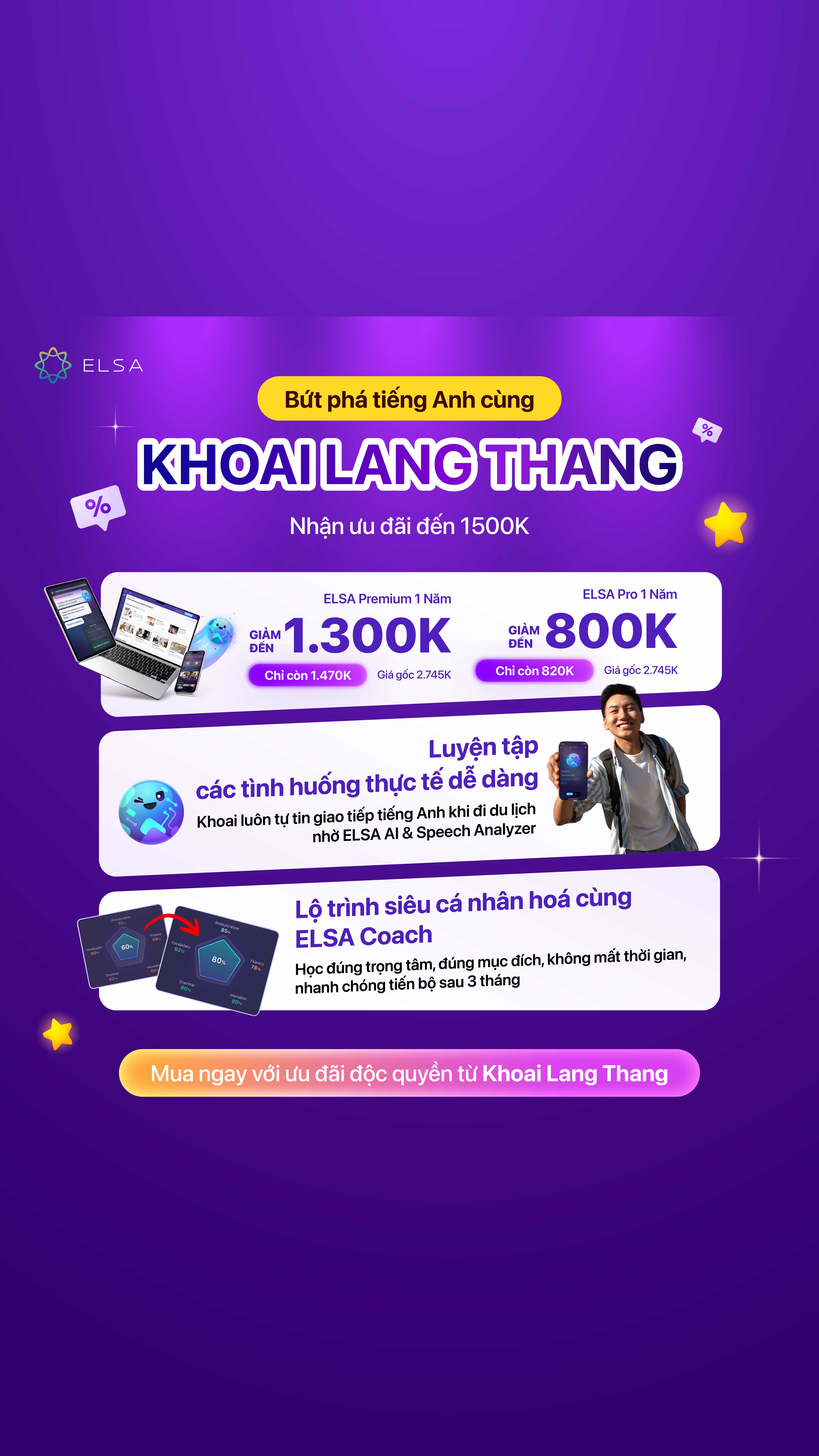 📢1 phút quảng cáo: ELSA Speak là app học tiếng Anh tại nhà đơn giản cho người mới bắt đầu. Ứng dụng sẽ cung cấp nhiều mẫu câu, đoạn hội thoại sát với thực tế, sử dụng nhiều cấu trúc, từ loại phổ biến để giúp bạn ôn luyện ngữ pháp tốt hơn.