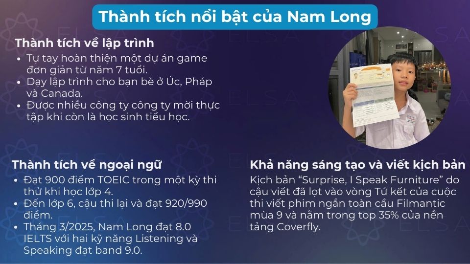 Gần đây nhất, vào tháng 3/2025, Nam Long đạt 8.0 IELTS với hai kỹ năng Listening và Speaking đạt band 9.0.