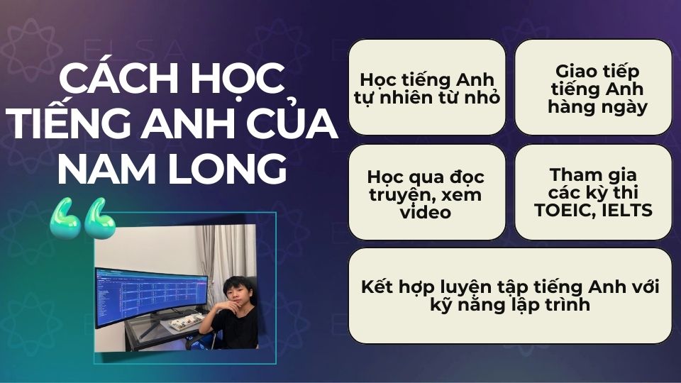 - Kết hợp luyện tập tiếng Anh với kỹ năng lập trình: Ngoài khả năng ngôn ngữ, Nam Long còn tận dụng tiếng Anh khi nghiên cứu lập trình và công nghệ. Việc thường xuyên tiếp xúc với tài liệu, video hướng dẫn và diễn đàn quốc tế bằng tiếng Anh giúp cậu vừa phát triển chuyên môn, vừa trau dồi khả năng đọc hiểu và diễn đạt tiếng Anh trong ngữ cảnh học thuật.