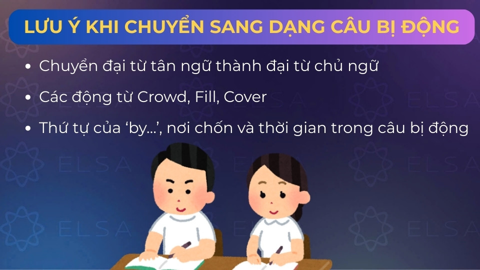 Đối với các câu chứa một trong ba động từ crowd, fill, cover, khi chuyển câu từ chủ động sang bị động, ta sử dụng “with” thay cho “by” ở phía trước tân ngữ.