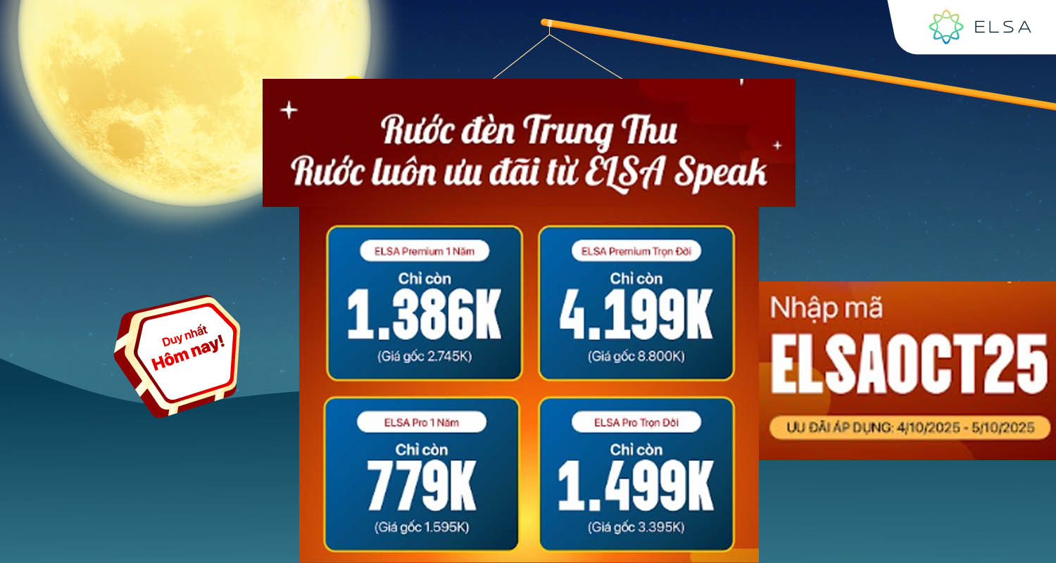 >> Có thể bạn quan tâm: ELSA Premium là người bạn đồng hành tuyệt vời cho những ai đang muốn tự tin hơn trong giao tiếp tiếng Anh. Đăng ký ngay hôm nay để nhận nhiều ưu đãi và bắt đầu hành trình học tập hiệu quả hơn mỗi ngày.