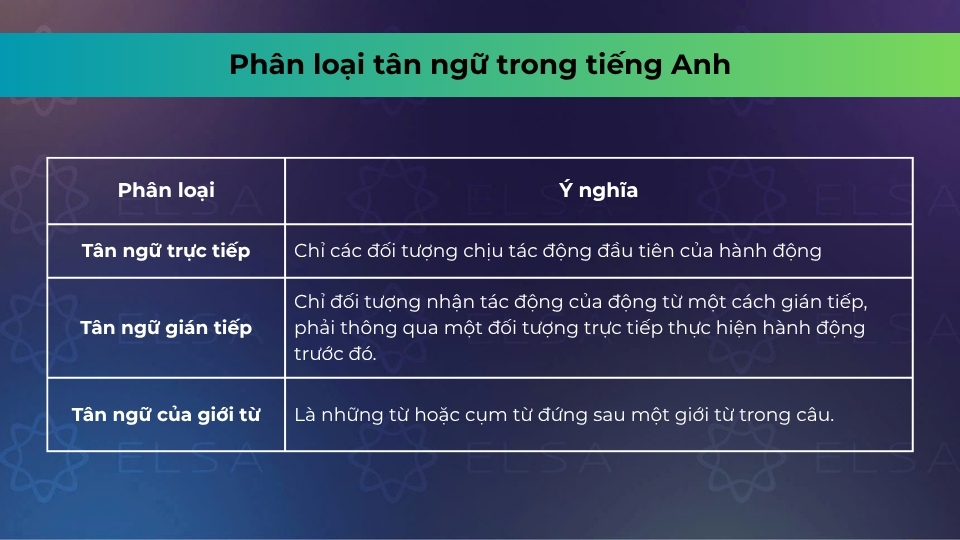 Trong tiếng Anh, tùy vào vị trí và ý nghĩa của Object trong câu có thể chia làm 3 loại như sau: