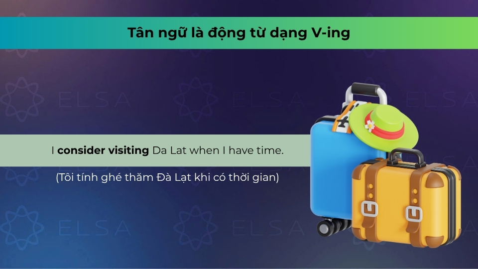 Ví dụ: I consider visiting Da Lat when I have time. (Tôi tính ghé thăm Đà Lạt khi có thời gian).