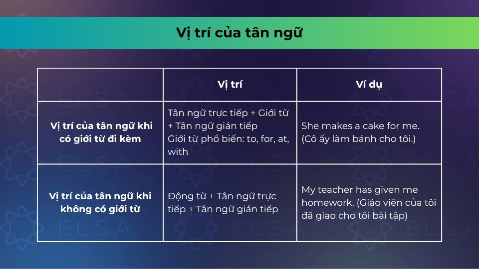 - Vị trí: Động từ + Tân ngữ trực tiếp + Tân ngữ gián tiếp