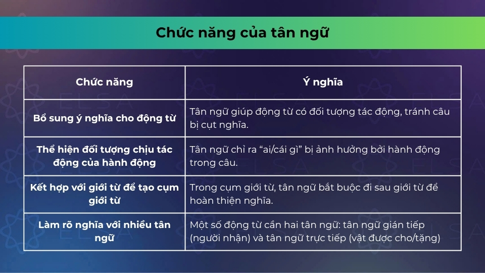 Trong ngữ pháp tiếng Anh, tân ngữ (Object – O) giữ vai trò quan trọng trong câu. Dưới đây là những chức năng chính của tân ngữ: