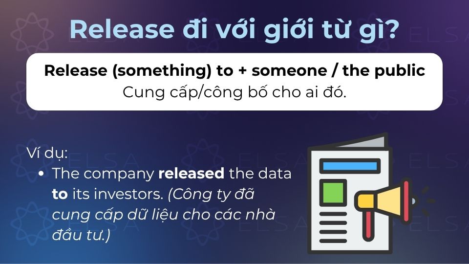Release có thể đi với các giới từ như: of, from, into, to, for và on. Mỗi giới từ lại mang ý nghĩa và cách sử dụng khác nhau. Cùng ELSA Speak tìm hiểu chi tiết dưới đây: