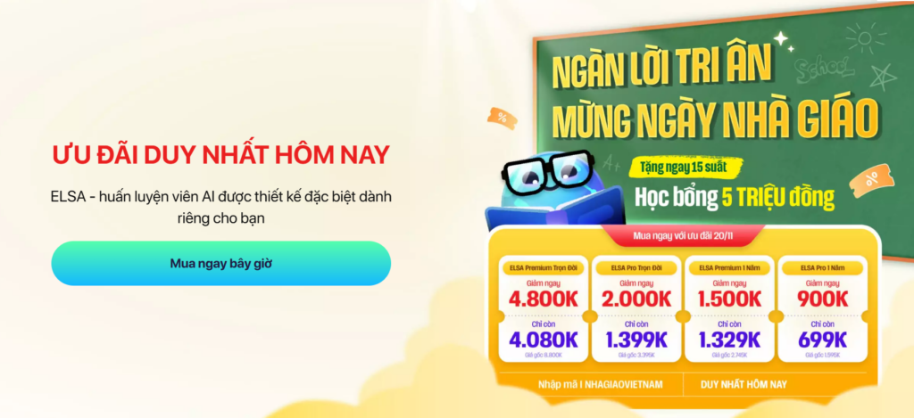 Hot: ELSA Speak vừa mở bán trở lại gói ELSA Pro, ELSA Premium với phiên bản 2025 cực xịn sò. Mừng quay trở lại với diện mạo mới – Elsa Premium, Elsa Pro giảm GIẢM GIÁ HẤP DẪN trong duy nhất hôm nay.