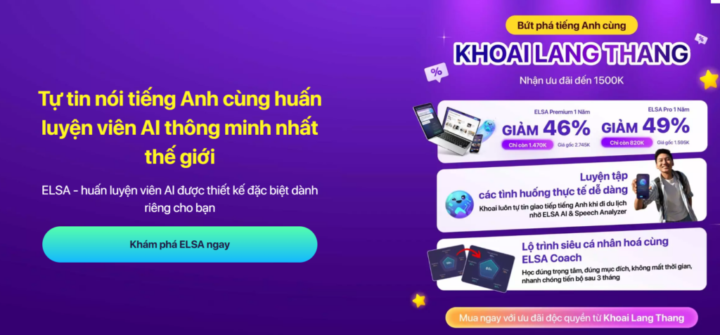 Hot: ELSA Speak vừa mở bán trở lại gói ELSA Pro, ELSA Premium với phiên bản 2025 cực xịn sò. Mừng quay trở lại với diện mạo mới – Elsa Premium, Elsa Pro giảm GIẢM GIÁ HẤP DẪN trong duy nhất hôm nay.