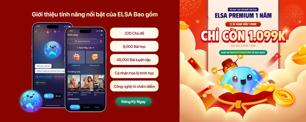 Bạn muốn chinh phục phần thi IELTS Speaking với phát âm tiếng Anh chuẩn như người bản xứ và tự tin hơn? Đừng bỏ lỡ gói ELSA Premium để thực hành phát âm chuẩn mỗi ngày và bứt phá điểm số IELTS Speaking!