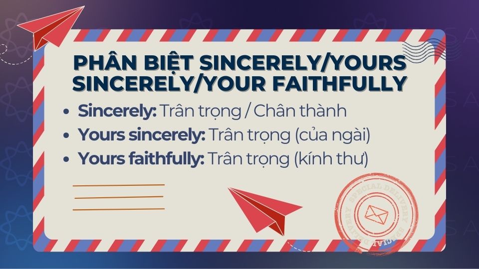 | Sincerely | Trân trọng/Chân thành | Người đã biết tên (Dear Mr. A, Dear Ms. B) | Anh – Mỹ (US): Rất phổ biến. Anh – Anh (UK): Ít dùng hơn. |