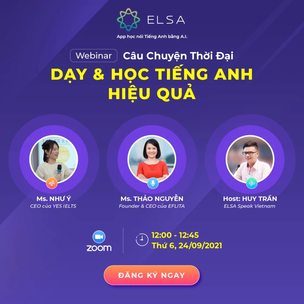 Vừa qua, vào thứ sáu, 24/9/2021, ELSA Speak đã tổ chức thành công buổi Webinar “Câu Chuyện Thời Đại: DẠY & HỌC TIẾNG ANH HIỆU QUẢ” trên nền tảng ứng dụng Zoom với khách mời đến từ YES IELTS và EFLITA.